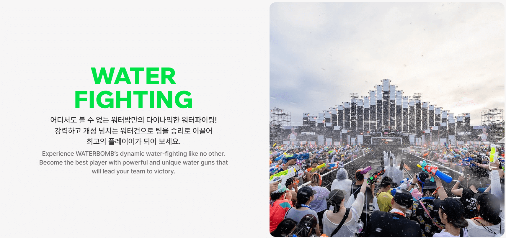 워터밤은 뮤직 페스티벌의 새로운 패러다임을 제시하였습니다. 음악, 예능, 물놀이를 결합하여 관객과 아티스트가 함께 공연을 즐기며 만들어가는 짜릿하고 특별한 경험을 선사합니다.