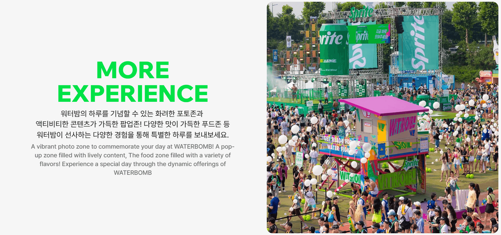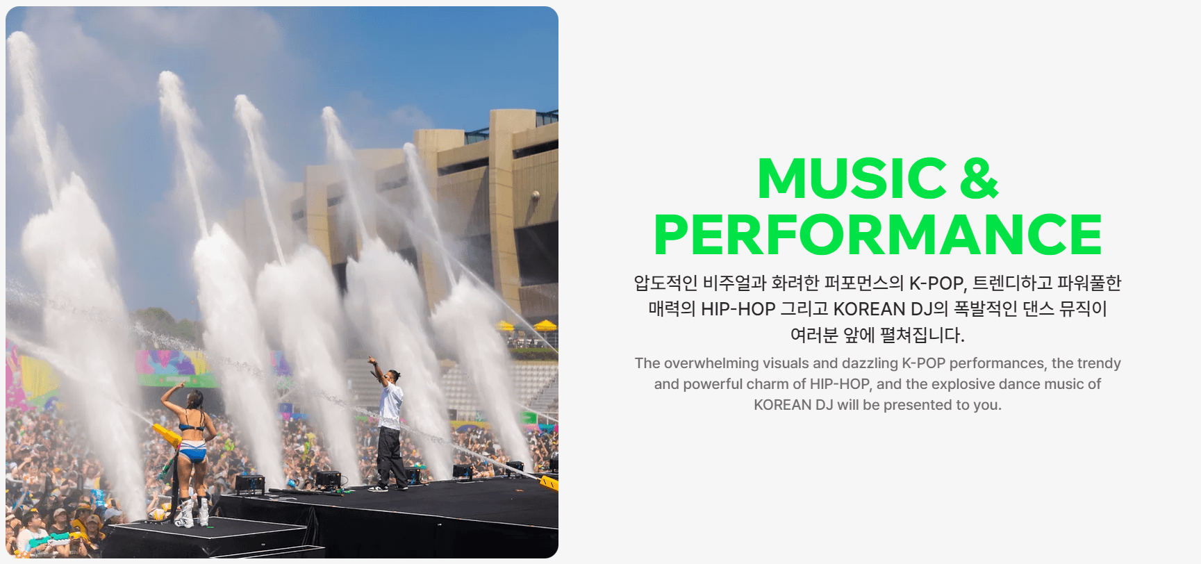 시원한 워터 파이팅과 멋진 뮤지션들의 공연을 즐기며 도시로부터 탈출하세요.