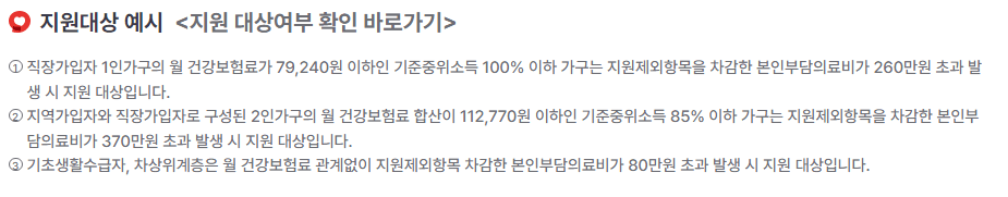 - 의료비기준 : 1회 입원에 따른 가구의 연소득 대비 의료비 부담액 (급여 본인부담, 비급여 및 선별급여 본인부담 등)이 10% 초과시 지원