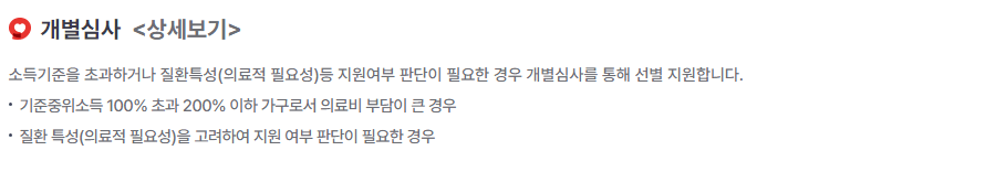- 지원기준 미충족 시에도 부담능력 대비 과도한 의료비 발생 시 지원받을 수 있도록 개별심사제도를 통해 탄력적 지원