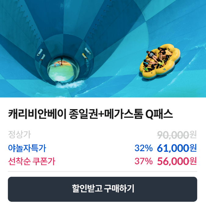 이번 달 말인 6월 30일 일요일 까지 특가가 진행되며, 선착순 마감되는 이벤트도 있으니 올 여름 캐리비안베이에 가실 예정이라면 지금 당장! 야놀자로 Go, Go 하셔서 미리 예매해놓는 것을 추천드립니다!!