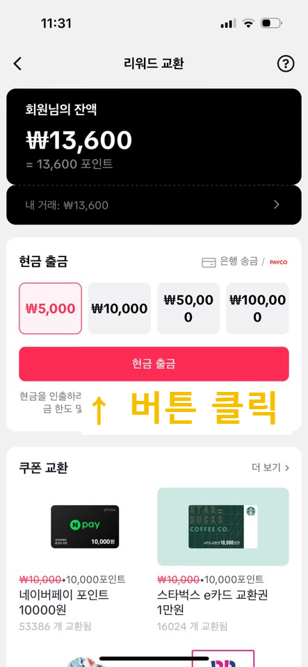 아, 출금버튼 누르기 전에 금액도 선택해주세요! 아래 사진에는 5천원이 선택되어 있지만 저는 1만원을 선택해서 출금했어요.