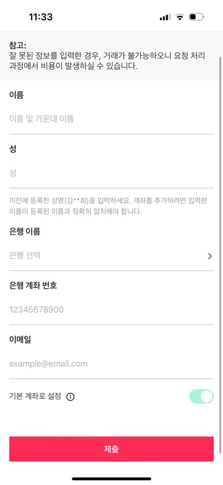 버튼을 클릭하면 인출방법을 선택하고, 개인 정보를 입력하게 됩니다. 본인 이름과 본인 계좌를 입력하고 제출을 합니다.