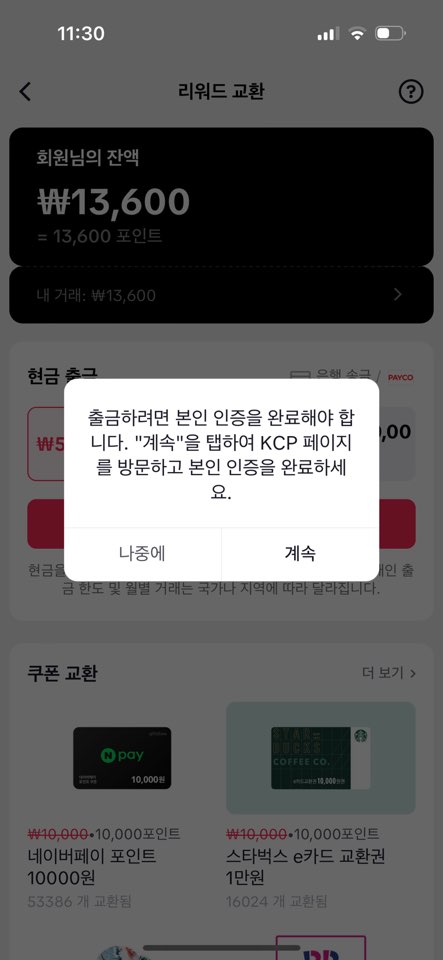 본인인증이 완료되면 포인트를 현금으로 출금하거나 쿠폰으로 교환할 수 있습니다. 쿠폰도 다양하게 준비되어 있어 쏠쏠하게 쓸 수 있을 것 같았지만, 저희는 현금으로 출금할거라 바로 '현금 출금' 버튼을 클릭합니다.
